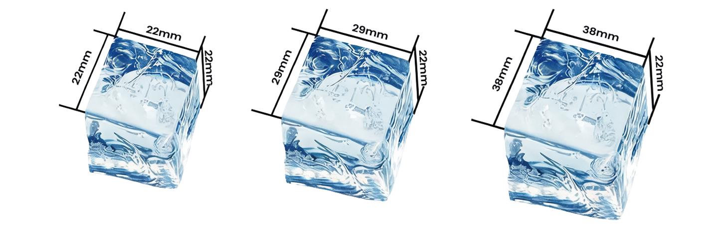 38*38*22 mm (Large Thick Cube): Designed for upscale bars and premium dining environments, featuring an exceptionally slow melting rate.
